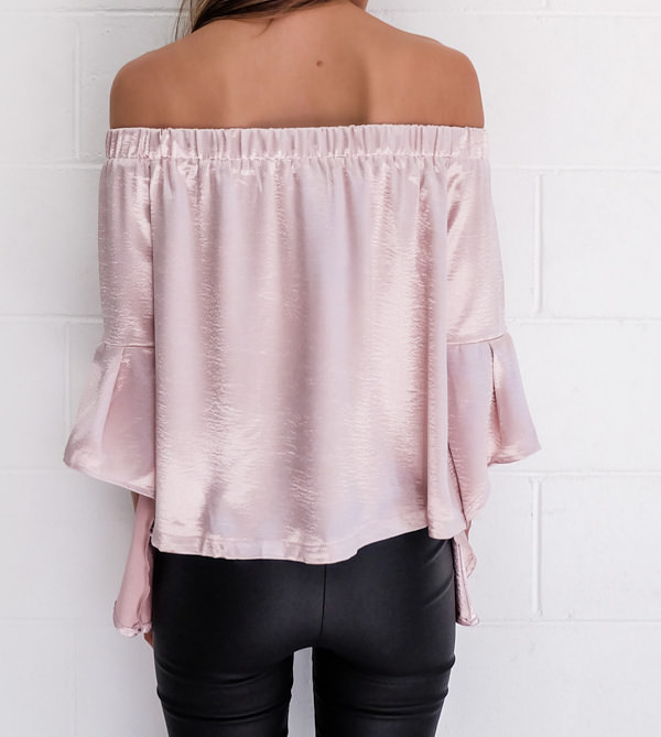 Pink Off Shoulder Flare Sleeve Blouse Satin