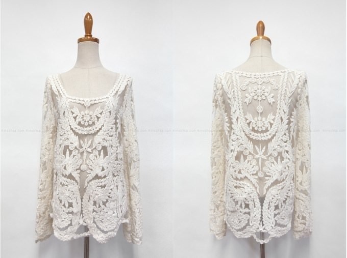 Lace Embroidered crochet Casual shirt blouse tops blusas Long sleeve White