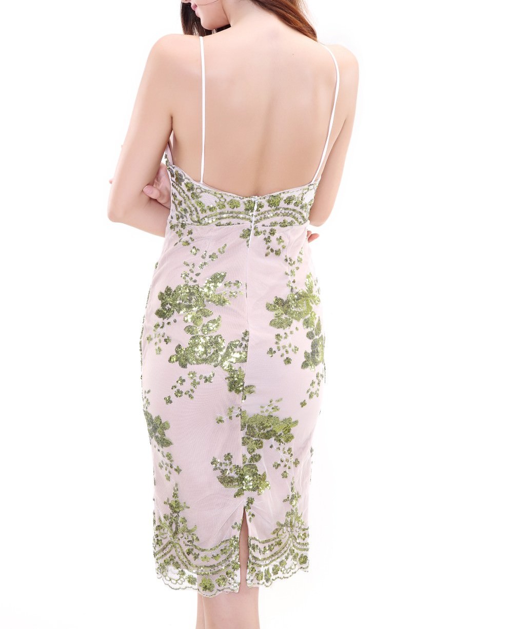 Green Sequined Elegant Bodycon Nippon Flower V-neck Dress